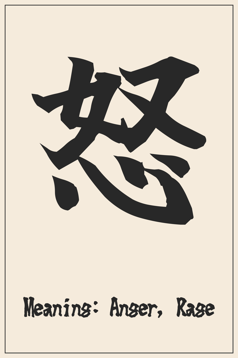 In Japanese culture, while anger is acknowledged as a natural human response, there is often an emphasis on its control and appropriate expression. This kanji can thus symbolize not just the emotion itself, but also the inner struggle and the strength required to master one’s feelings, turning potential destructiveness into focused resolve or righteous indignation.