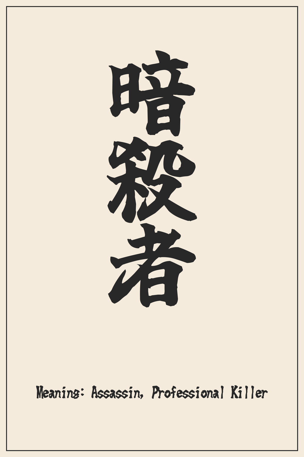 The Kanji 暗殺者 is a powerful emblem for those who resonate with the themes of stealth, skill, and the execution of critical missions from the shadows. It signifies a disciplined individual, precise in action and resolute in purpose, embodying an unconventional form of strength.