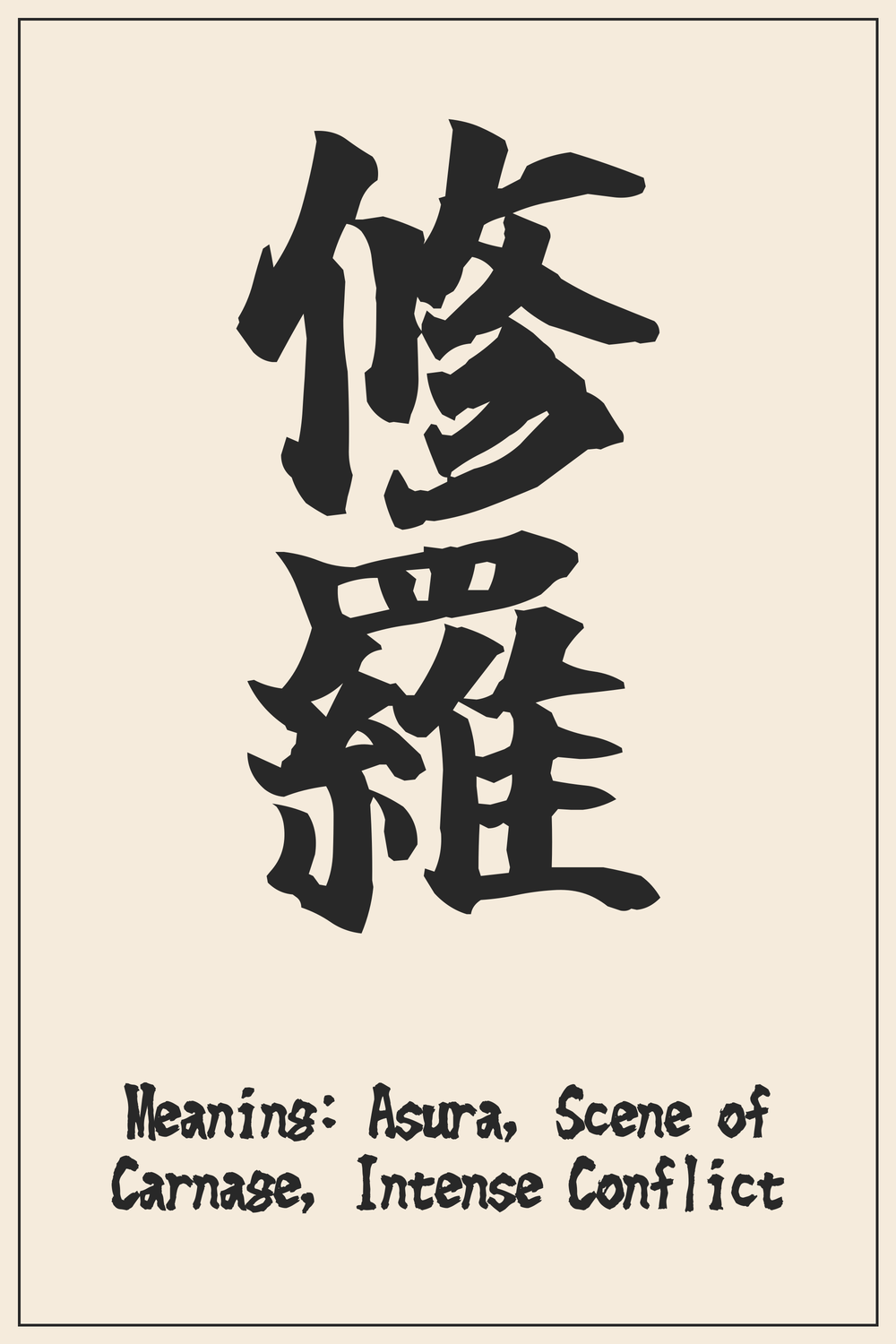 In Japanese culture, “Shura” often appears in phrases like “shuraba” (修羅場), meaning a scene of intense conflict, chaos, or a difficult challenge. It embodies a state of relentless effort, profound struggle, or an unyielding, fierce spirit, often invoked when describing warriors, artists, or anyone facing immense trials.