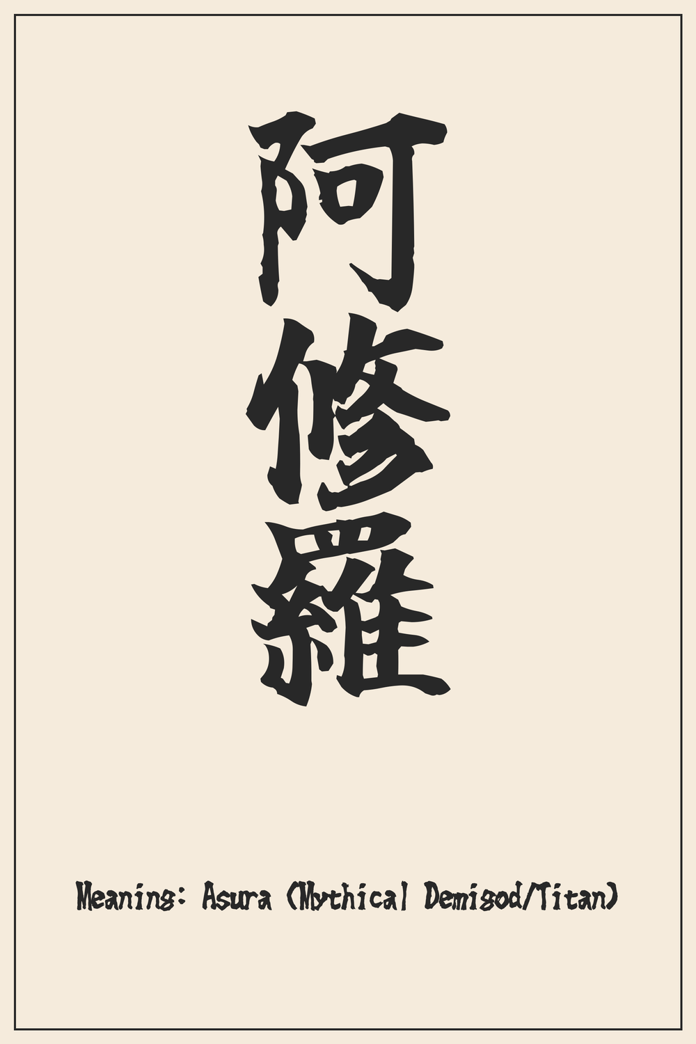 The compound kanji 阿修羅 (Ashura) is formed by three characters, each contributing to the multifaceted meaning of this mythical entity.