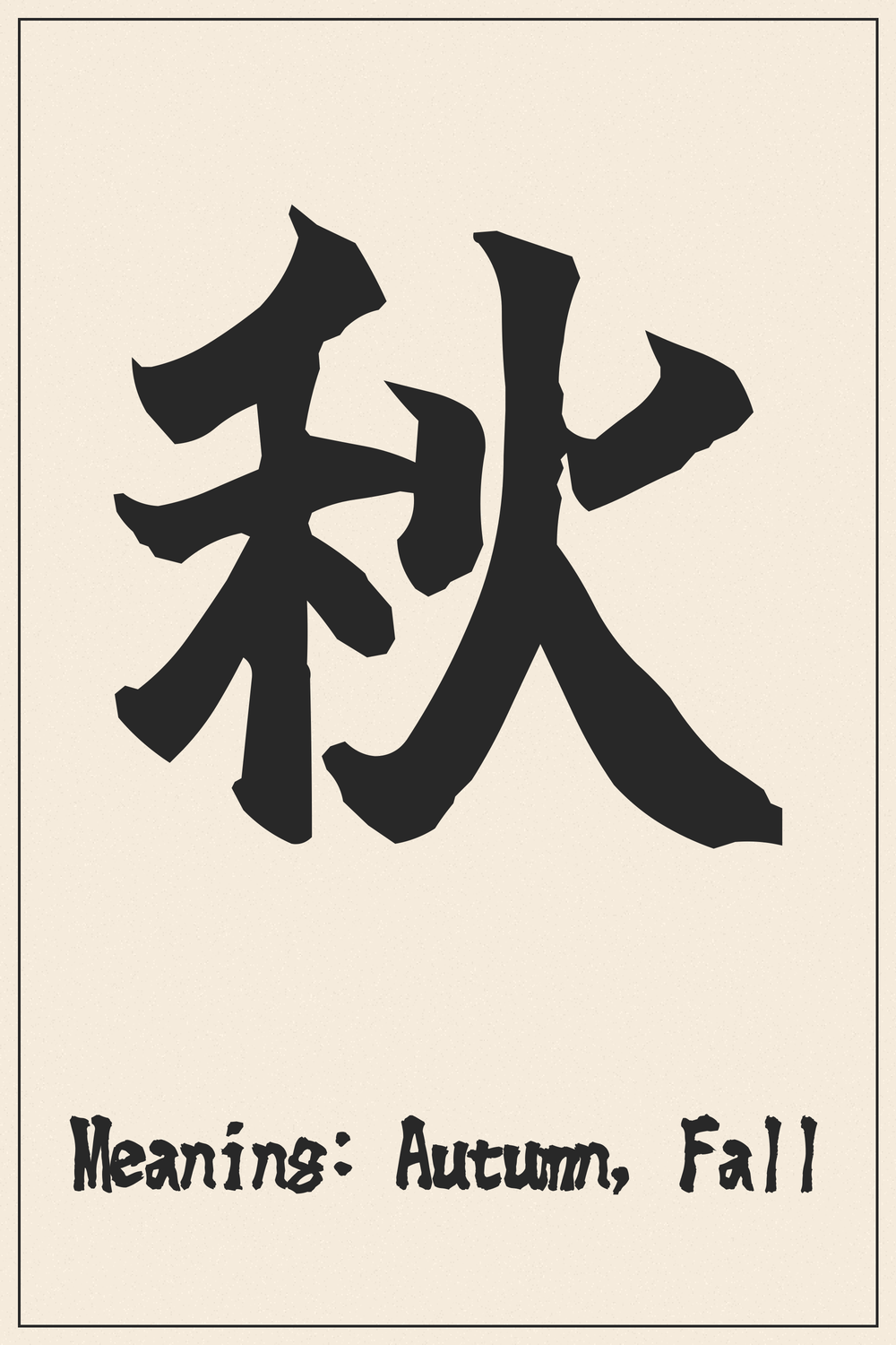 The Kanji 秋 beautifully encapsulates the essence of autumn—a season of harvest, reflection, and profound natural transformation. It symbolizes the culmination of growth, the splendor of changing colors, and a serene period of transition before winter.