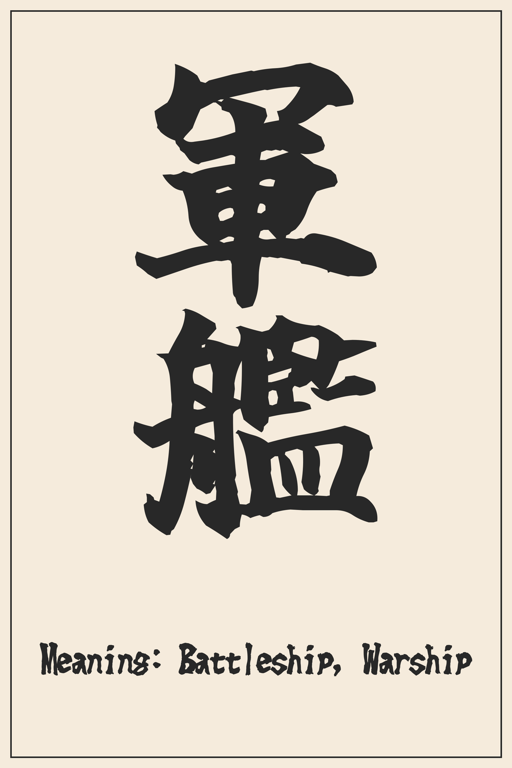The Kanji 軍艦 (Gunkan) embodies the formidable power and strategic might of naval warfare. Representing a battleship or warship, it symbolizes strength, defense, and technological advancement.