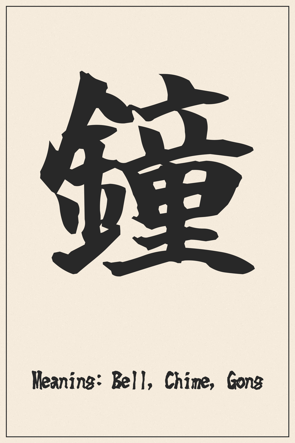 The phonetic component is 童 (dō), meaning ‘child’ or ‘youth’, which also lends its sound to create a sense of ‘chime’ or ‘sound’. Together, these components eloquently form a character that represents a metal instrument designed to produce a clear, resonant sound. In Japanese culture, the 鐘, particularly the temple bell (梵鐘, bonshō), holds deep spiritual significance, often rung to mark time, aid in meditation, or cleanse the soul during events like New Year’s Eve (除夜の鐘, Joya no Kane).