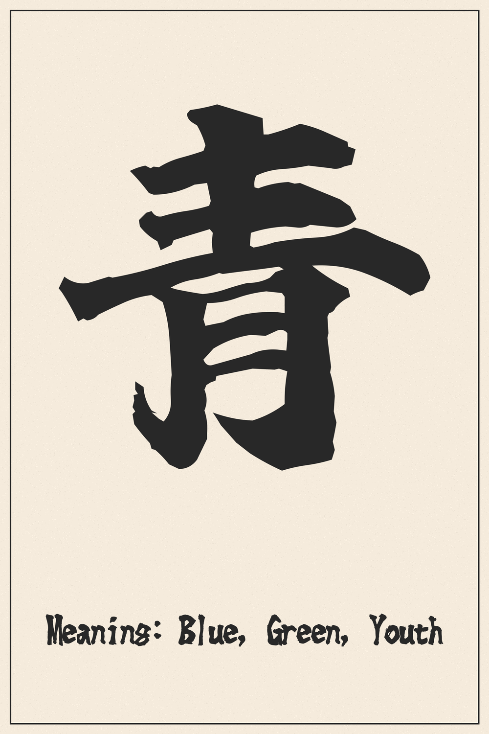 The Kanji 青 (Ao) embodies more than just a color; it’s a vibrant symbol of nature’s hues, youth, and freshness. It connects deeply with the vitality found in the natural world.