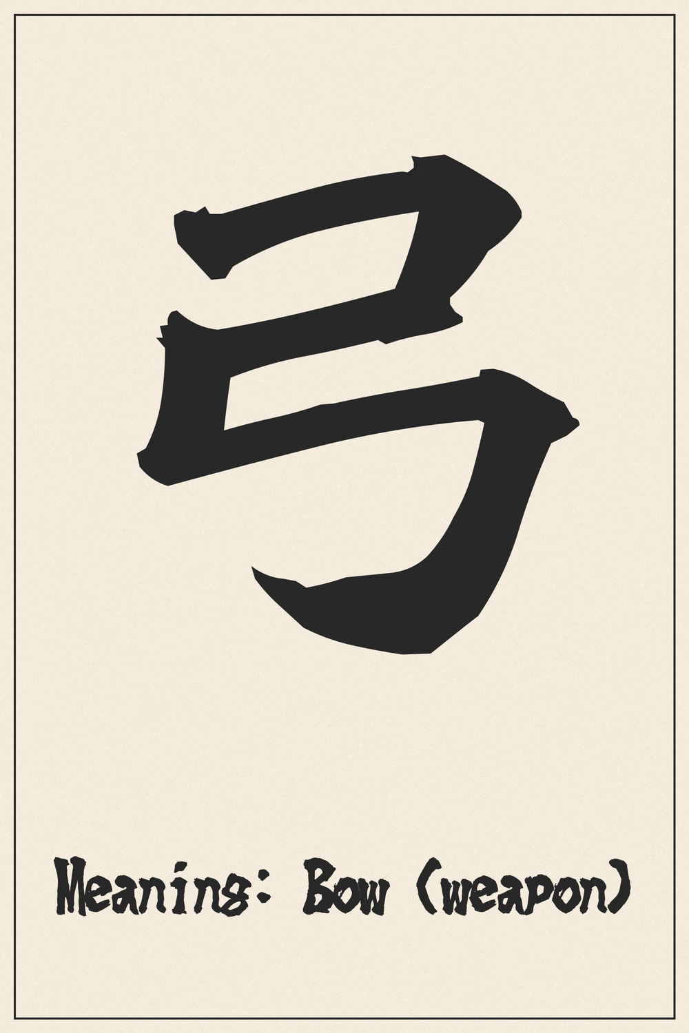 Bow: This character is a direct pictograph of a bow, illustrating its curved shape. It represents a fundamental tool for archery, symbolizing both its practical application as a weapon and its deeper connotations of skill, focus, and traditional martial arts.