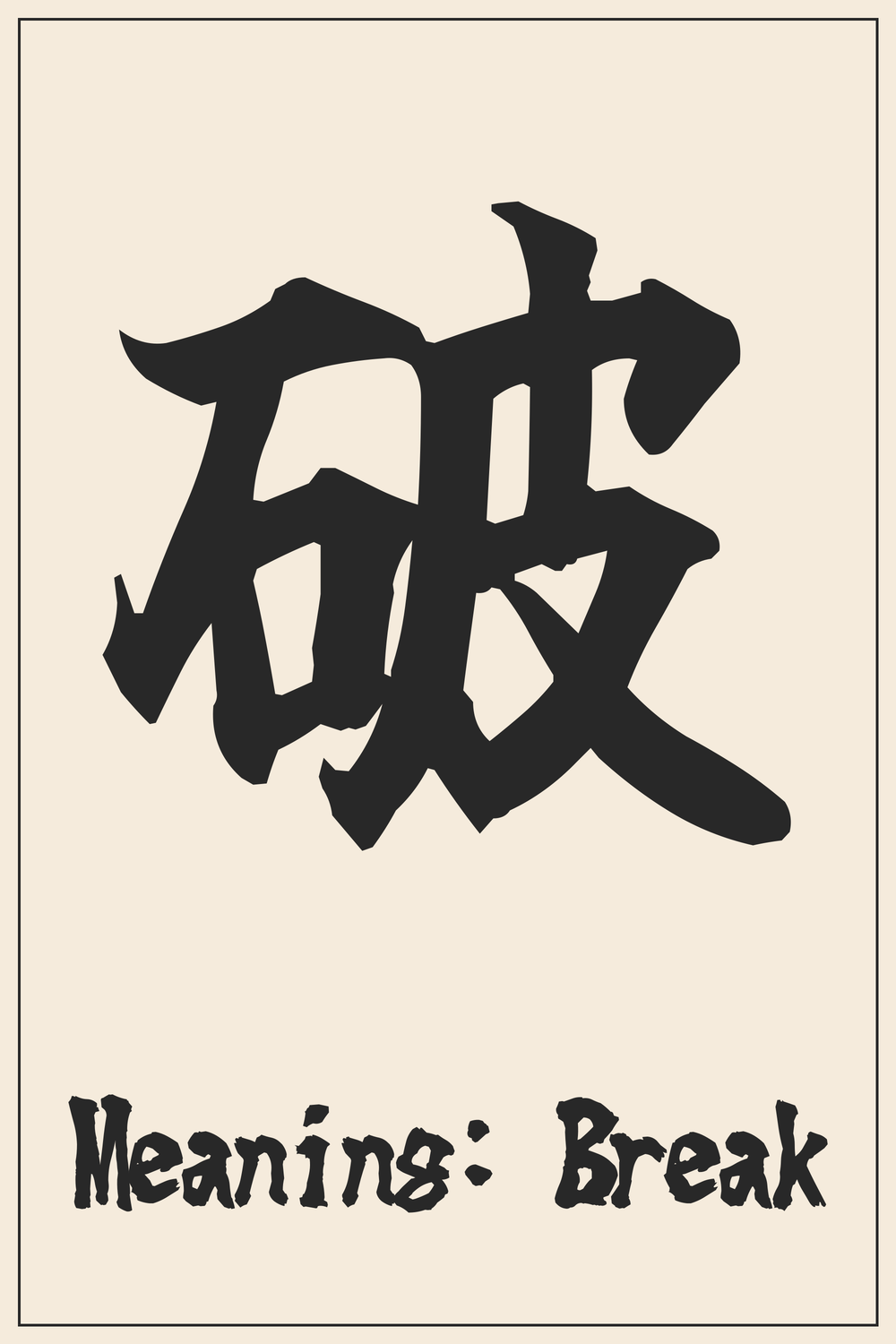 The kanji 破 symbolizes the idea of breaking through barriers and limitations. It embodies strength, transformation, and the courage to embrace change, reflecting the beauty of renewal and resilience.