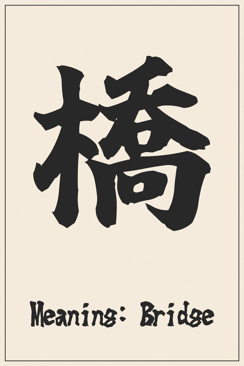 The character 橋 originally depicted a wooden bridge (木) over water, with the right side representing a tall structure or an elevated crossing. It elegantly conveys the idea of a path or structure that spans an obstacle.