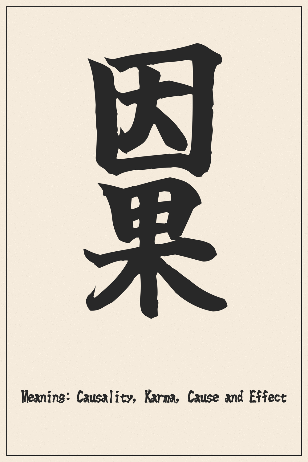 因果 (Inga) is a fundamental term in Buddhism, originating from Sanskrit (hetu-phala), meaning “cause and effect.” It describes the universal law that governs all phenomena, where every action (cause) inevitably leads to a corresponding outcome (effect).
