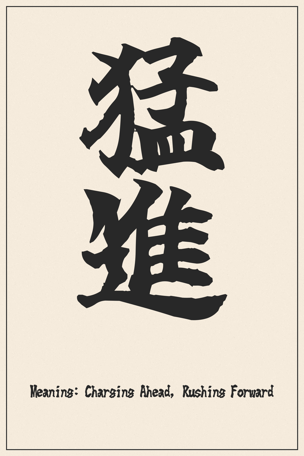 The Kanji compound ‘猛進’ encapsulates the raw power of relentless forward movement and unwavering determination. It speaks to an unstoppable drive, pushing past all obstacles with fierce resolve.