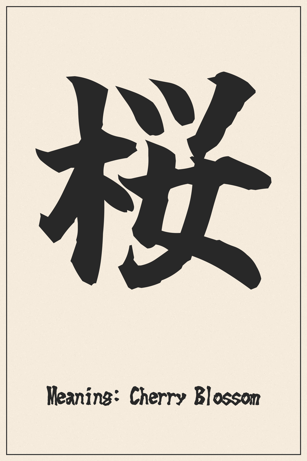 The Kanji 桜 (Sakura) refers to the cherry blossom, Japan’s national flower and a profound cultural symbol. It represents the arrival of spring and the concept of renewal.