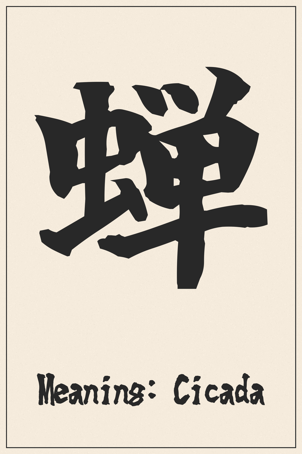 The Kanji 蝉 (Semi) captures the essence of summer with its piercing song and ephemeral existence. It symbolizes the vibrant yet fleeting nature of life, a profound theme for personal reflection.
