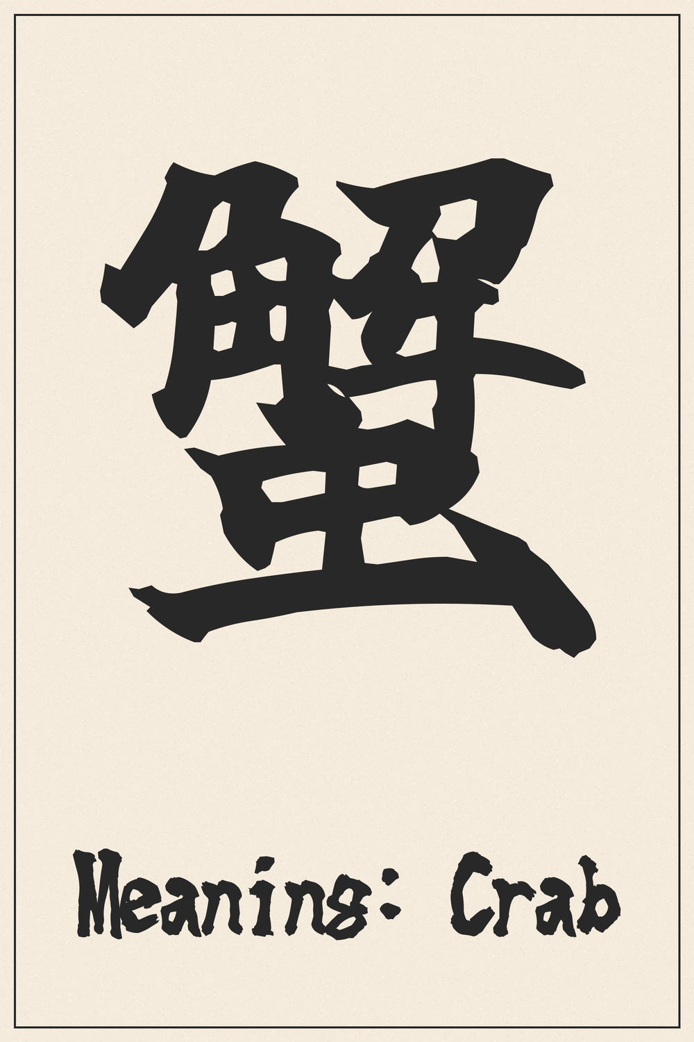 The Kanji 蟹 (Kani) intricately represents the crab, symbolizing aspects of protection, resilience, and the cyclical nature of life through molting. It’s a character that connects deeply with marine environments and the creatures within them.