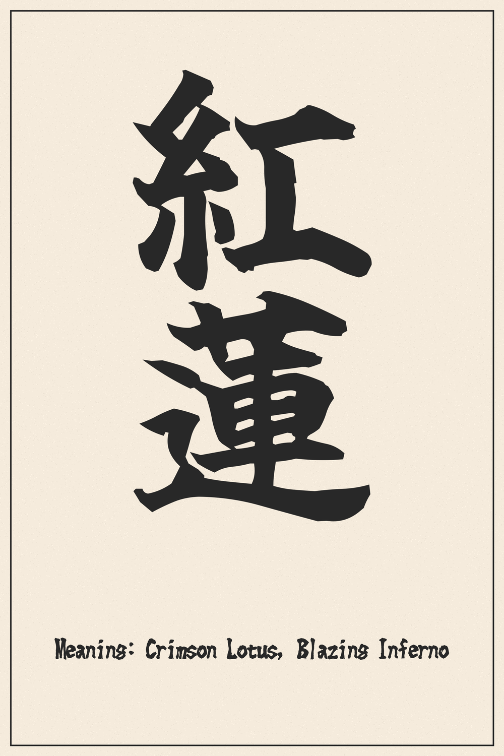 The Kanji compound 紅蓮 (Guren) evokes a powerful image of intense beauty and fierce destruction. It symbolizes a blazing crimson lotus, representing either a scorching inferno or a profound spiritual realm.