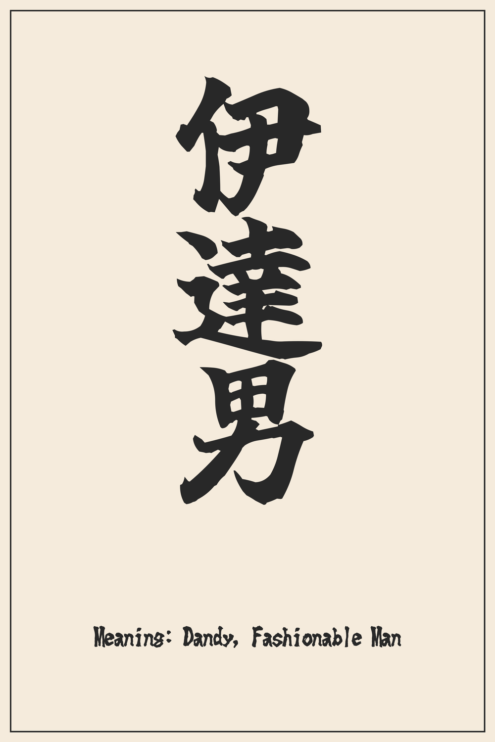 Embodying confidence and a distinctive flair, the Kanji for ‘伊達男’ captures the essence of a truly fashionable and spirited individual. It speaks to a persona defined by impeccable style and a bold attitude, rooted deeply in Japanese history.