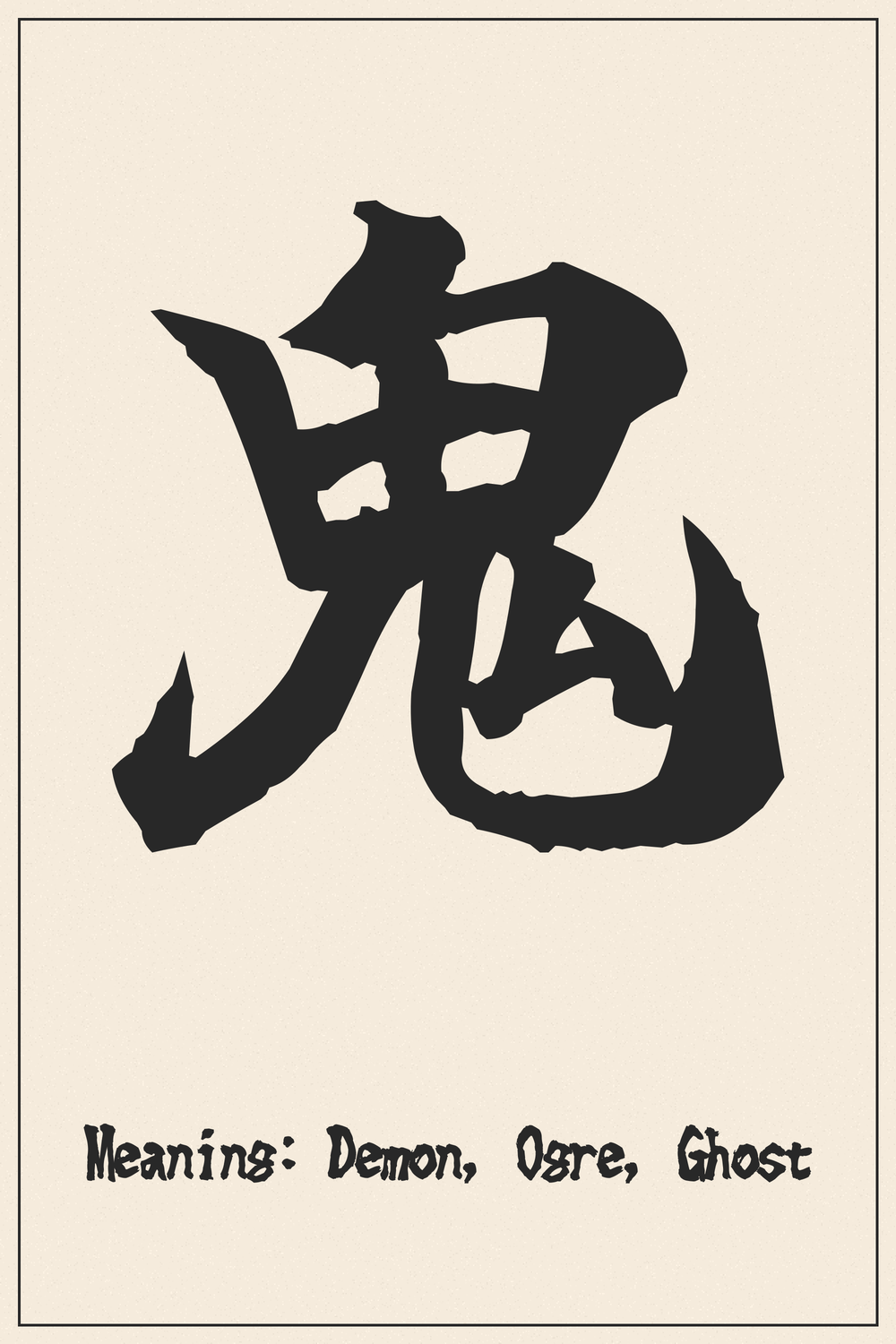 The character 鬼 (oni) has ancient origins, believed to be a pictograph depicting a fearsome, large-headed entity with a human-like body. Its earliest forms often emphasize a monstrous mask or face atop a figure, embodying the idea of an unseen, powerful spirit or being.