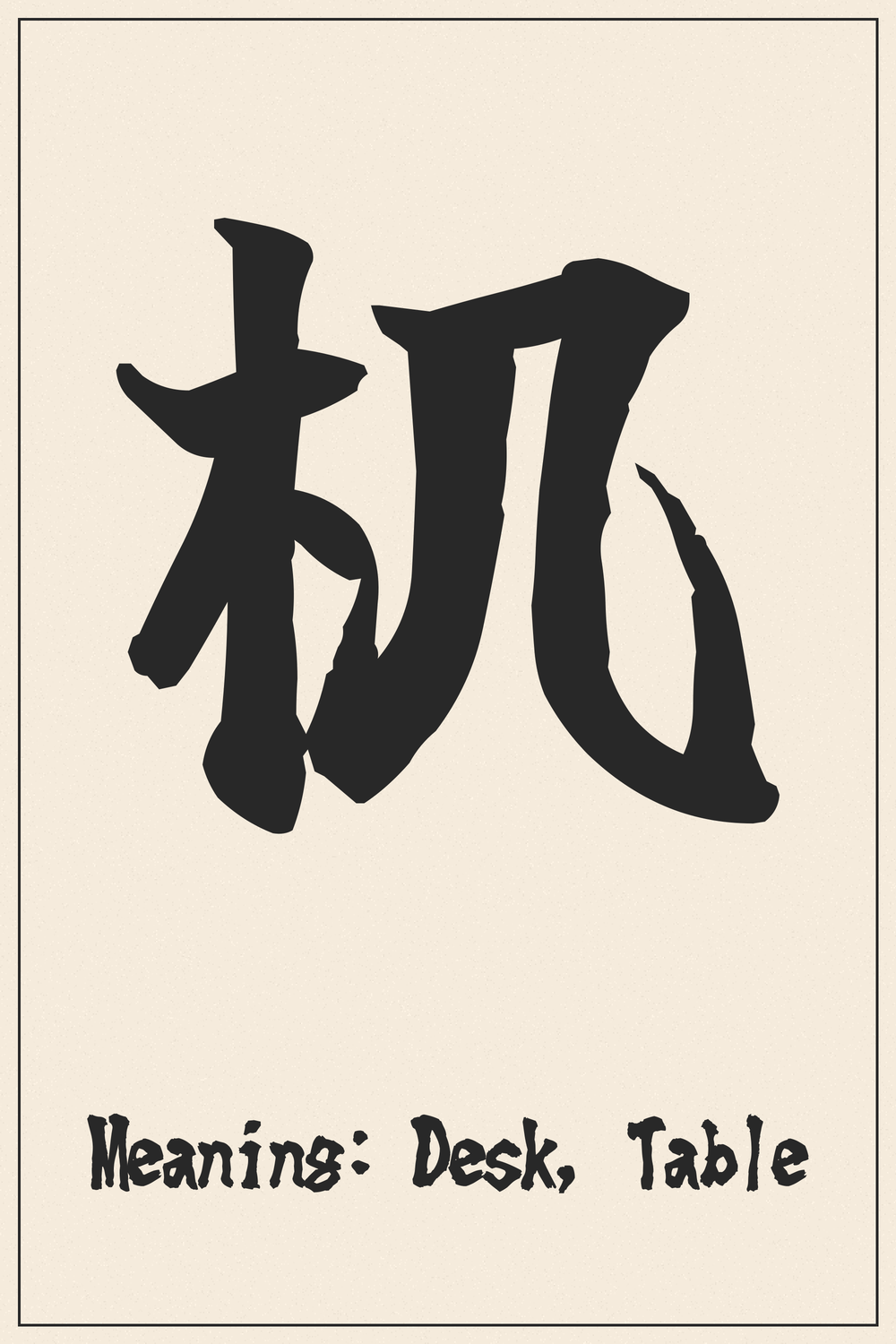 The Kanji 机 represents a desk or table, a common and functional piece of furniture. While it serves as a silent partner in intellectual pursuits and daily tasks, its meaning is straightforward and literal, rather than deeply symbolic or abstract.