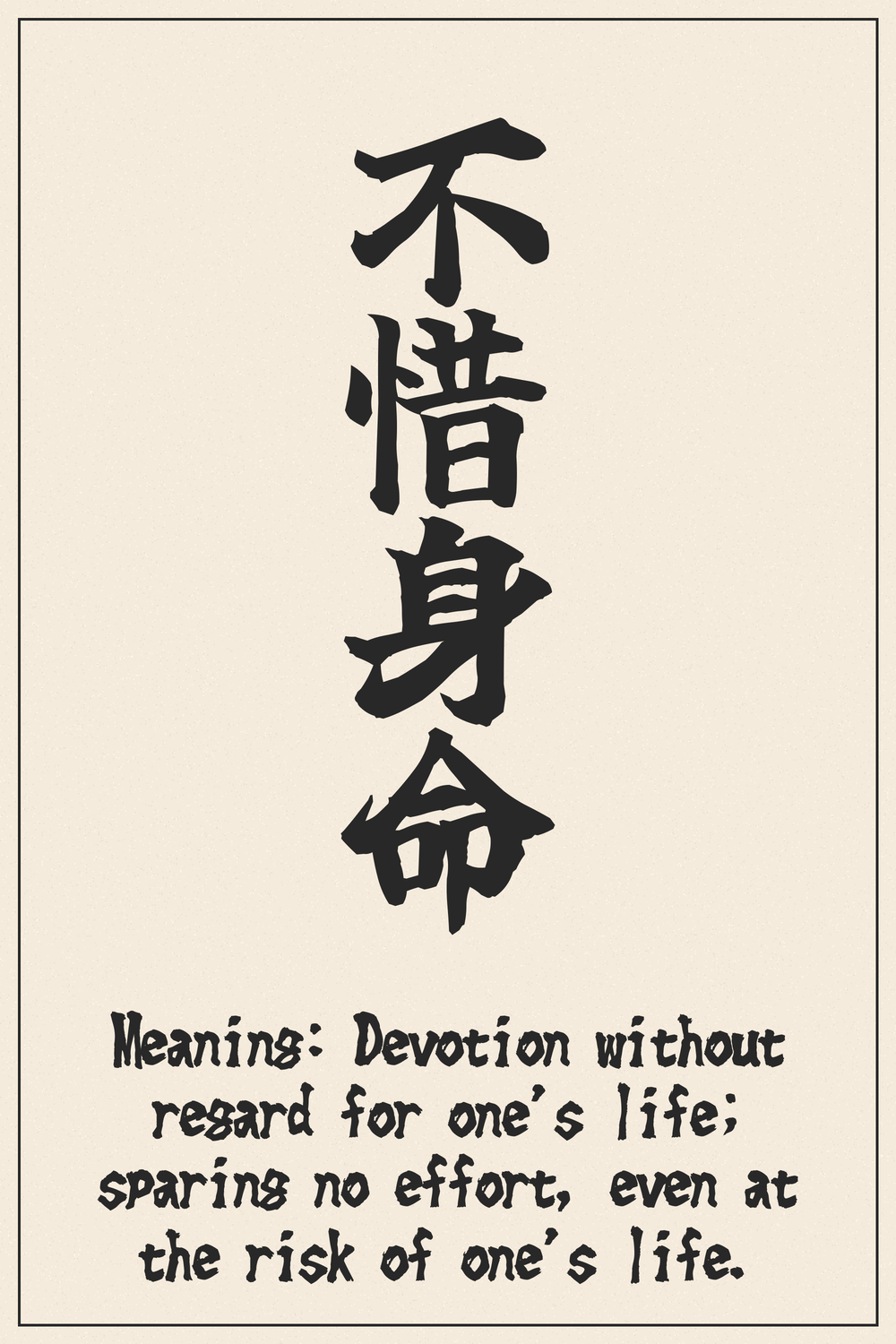 不惜身命 encapsulates the ultimate form of dedication and self-sacrifice, a philosophy of giving one’s all without reservation. It is a powerful reminder of unwavering resolve and commitment to a cause greater than oneself.