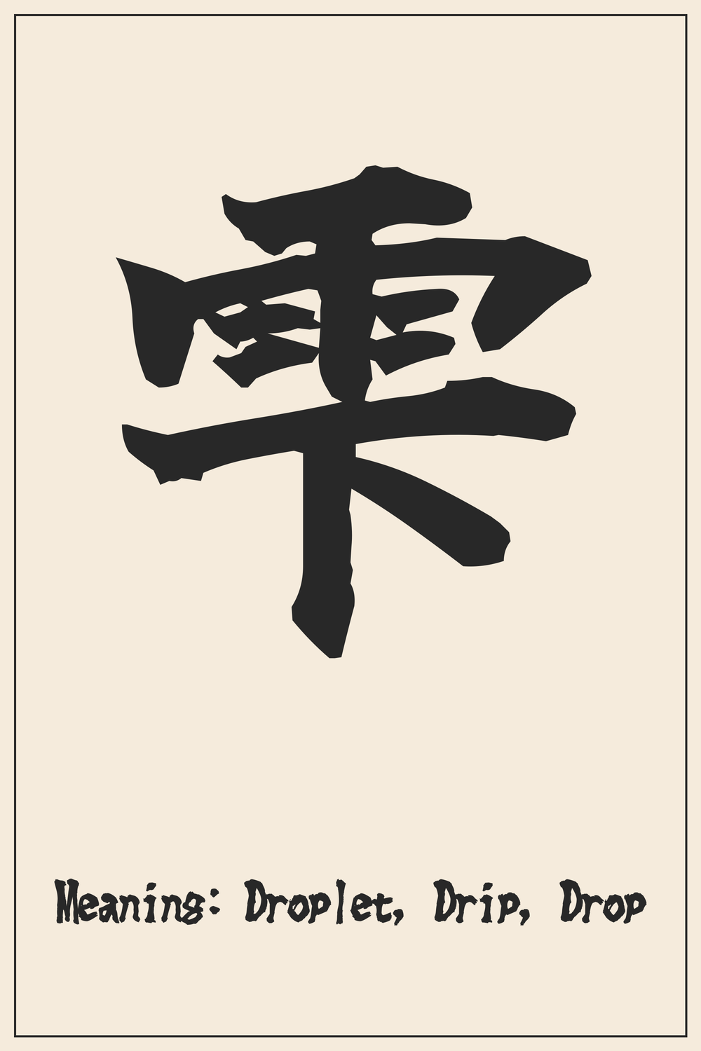 The character 雫 is a kokuji (国字), a character invented in Japan, not originally from China. It combines 雨 (ame), meaning “rain,” with下 (Below / Down), which here primarily serves a phonetic function, but also visually implies the idea of revolving or encircling, perhaps hinting at the formation of a drop.