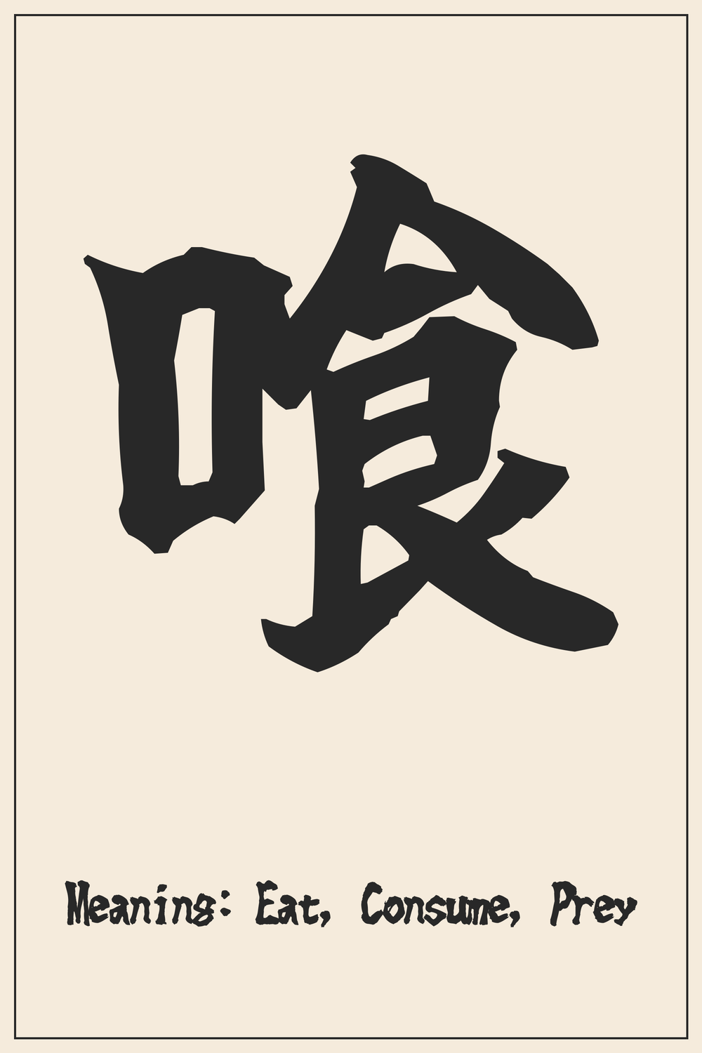 The Kanji 喰 embodies the fundamental act of consumption, representing not just eating, but a primal drive to devour and survive. It carries a potent energy, reflecting the raw instinct of life itself.