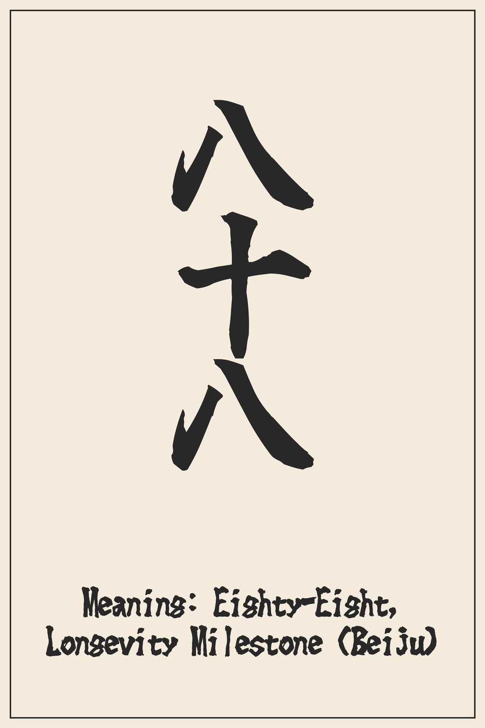 The Kanji compound 八十八 represents the number eighty-eight, but it carries a profound cultural significance beyond mere numeration. In Japanese tradition, it symbolizes longevity and is deeply associated with a significant life milestone.
