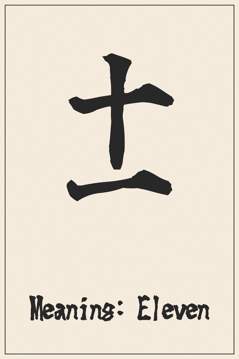 The Kanji ‘十一’ elegantly combines the characters for ‘ten’ and ‘one’ to form ‘eleven’, embodying a foundational aspect of counting and abstract thought. It represents simple progression and quantity.