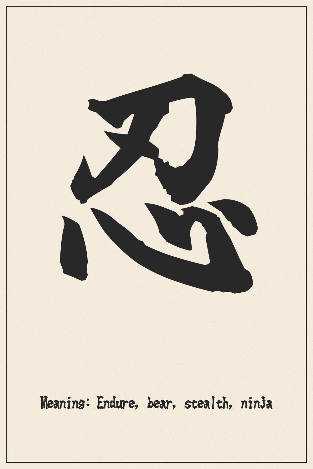 In Japanese culture, 忍 is deeply rooted in the concept of perseverance (我慢 – gaman) and is famously associated with the “ninja” (忍者 – ninja), who are masters of stealth, endurance, and silent action. It represents not just physical resilience but also mental fortitude and the ability to act subtly and effectively under pressure, making it a symbol of quiet strength and strategic patience.