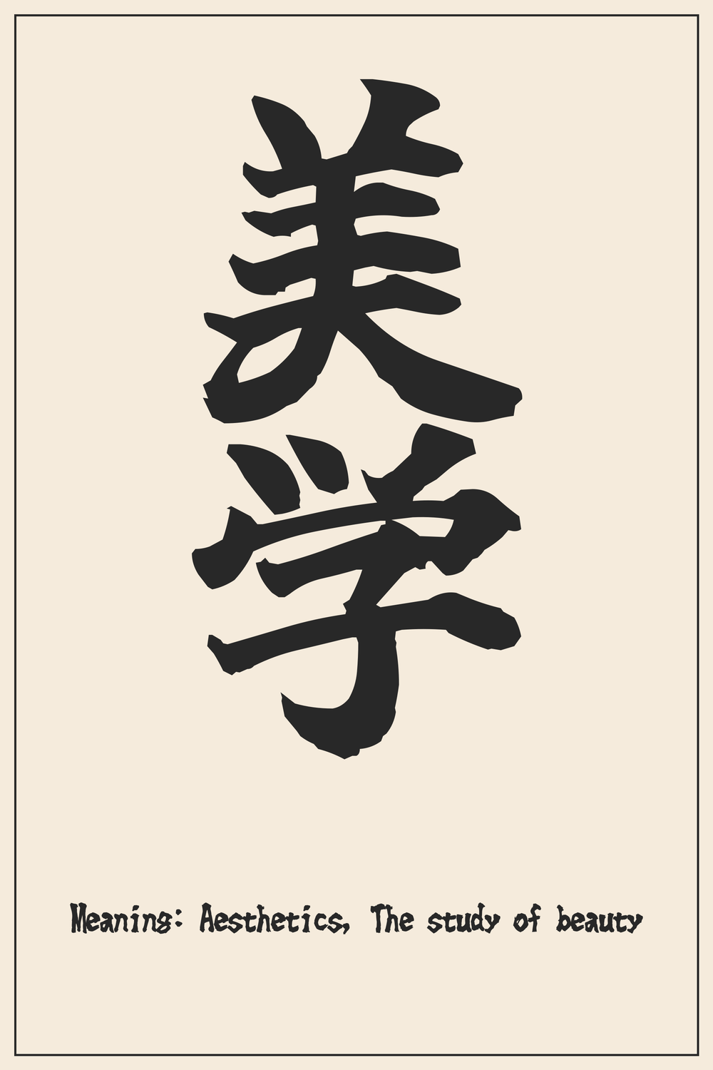 El compuesto kanji ‘美学’ es una representación sofisticada de la estética: la exploración filosófica de la belleza y el arte. Refleja un profundo aprecio por la expresión artística, la curiosidad intelectual y la búsqueda de comprender qué hace que algo sea bello.