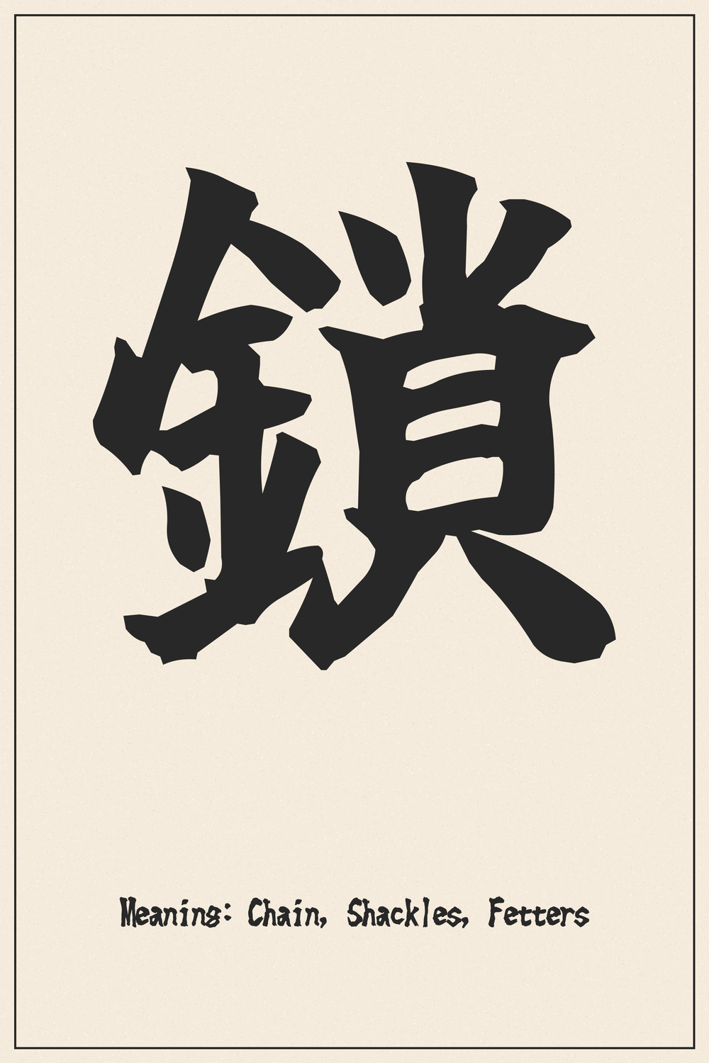 El kanji 鎖 (Kusari) denota principalmente una "cadena", con un rico simbolismo en la cultura japonesa. Puede representar un objeto físico utilizado para conectar o restringir, como una cadena de ancla o unas esposas. Más allá de su significado literal, suele aludir a vínculos inquebrantables, ya sean familiares o espirituales, o, por el contrario, a limitaciones y encarcelamiento, tanto físicos como metafóricos.
