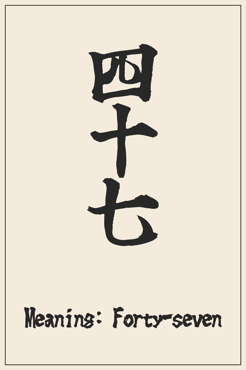 El kanji ‘四十七’ denota claramente el número cuarenta y siete, representando un aspecto fundamental de los sistemas numéricos. Su importancia se ve magnificada por la icónica historia de los 47 Ronin, que vincula este simple número con profundos temas de lealtad, honor y resistencia.