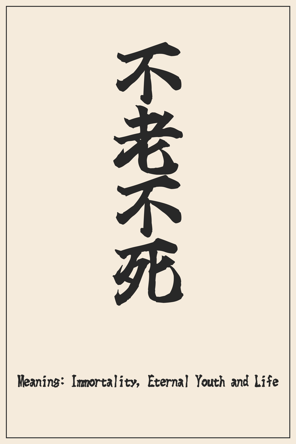 Elegir 不老不死 como tatuaje es una declaración profunda que simboliza no solo un deseo de longevidad, sino una conexión con aspiraciones humanas eternas y una creencia en las infinitas posibilidades de la vida.