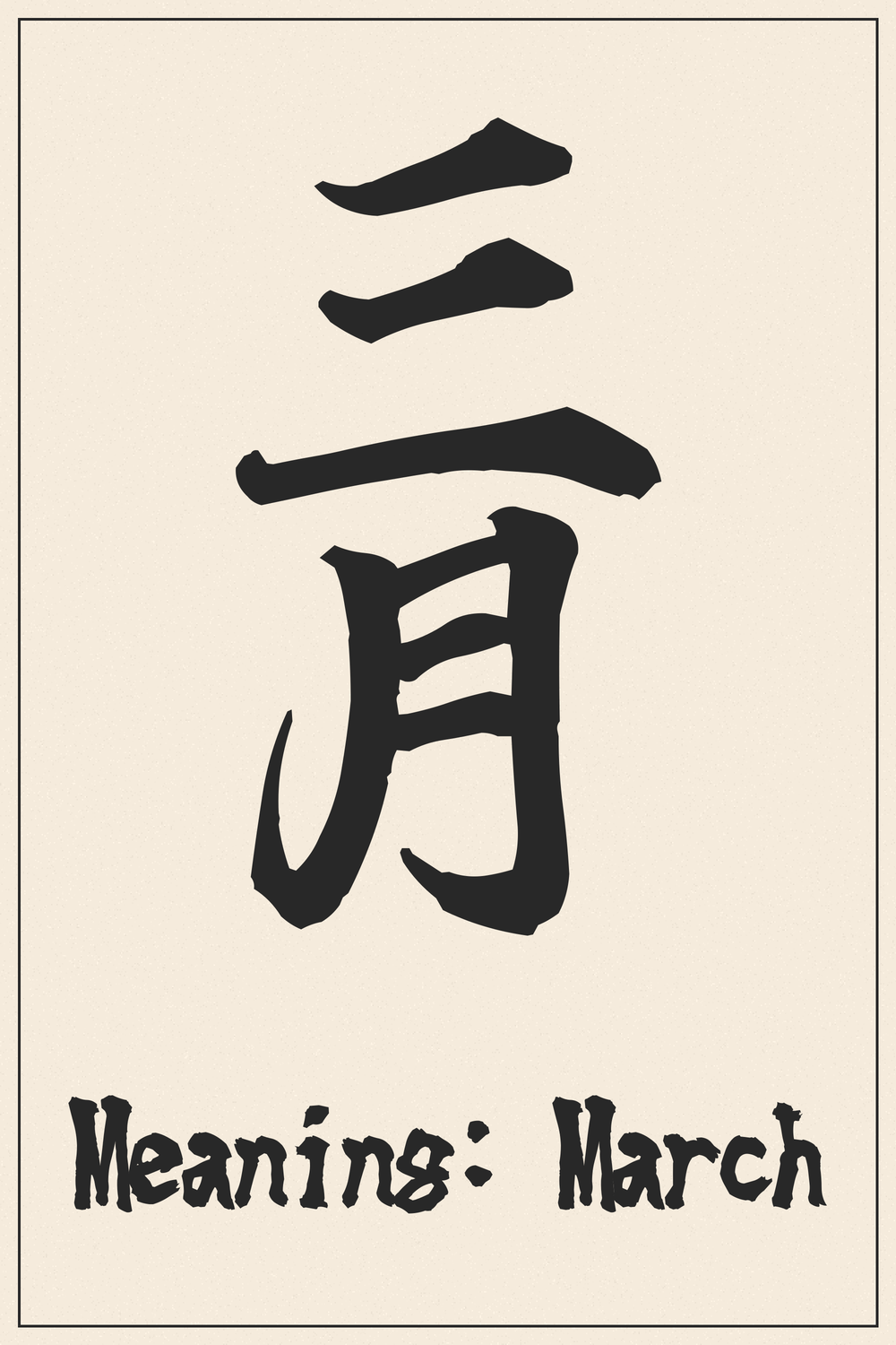 ‘三月’ se traduce literalmente como ‘tercer mes’. El carácter ‘三’ (san) representa el número tres, un antiguo símbolo de pluralidad y completitud. ‘月’ (gatsu/getsu) significa principalmente ‘luna’, pero también se usa para ‘mes’, ya que los ciclos lunares históricamente marcaban el tiempo.