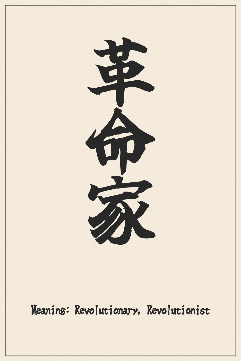 「革命家」 (Kakumeika) es una poderosa declaración de compromiso con un cambio profundo, ya sea a nivel personal o social. Representa a una persona que abraza la transformación, desafía las convenciones y se esfuerza por forjar su destino mediante la acción deliberada y la convicción.