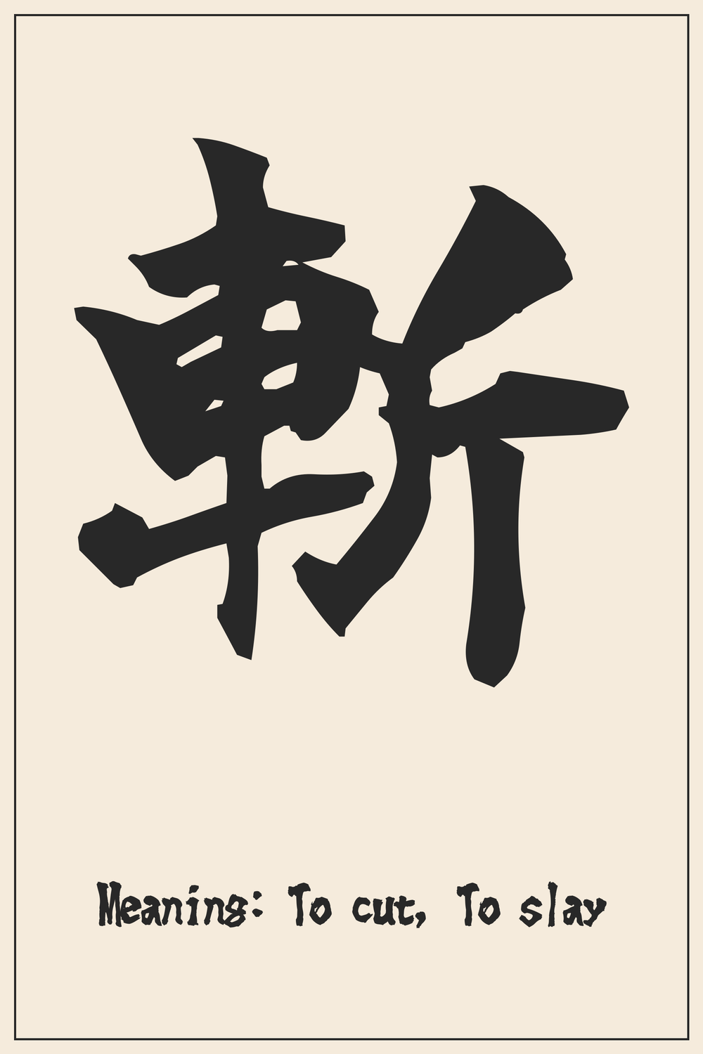 El kanji 斬 encarna la potencia bruta de un golpe decisivo, evocando siglos de tradición marcial. Representa no solo el corte, sino el acto de cortar con precisión y firmeza.