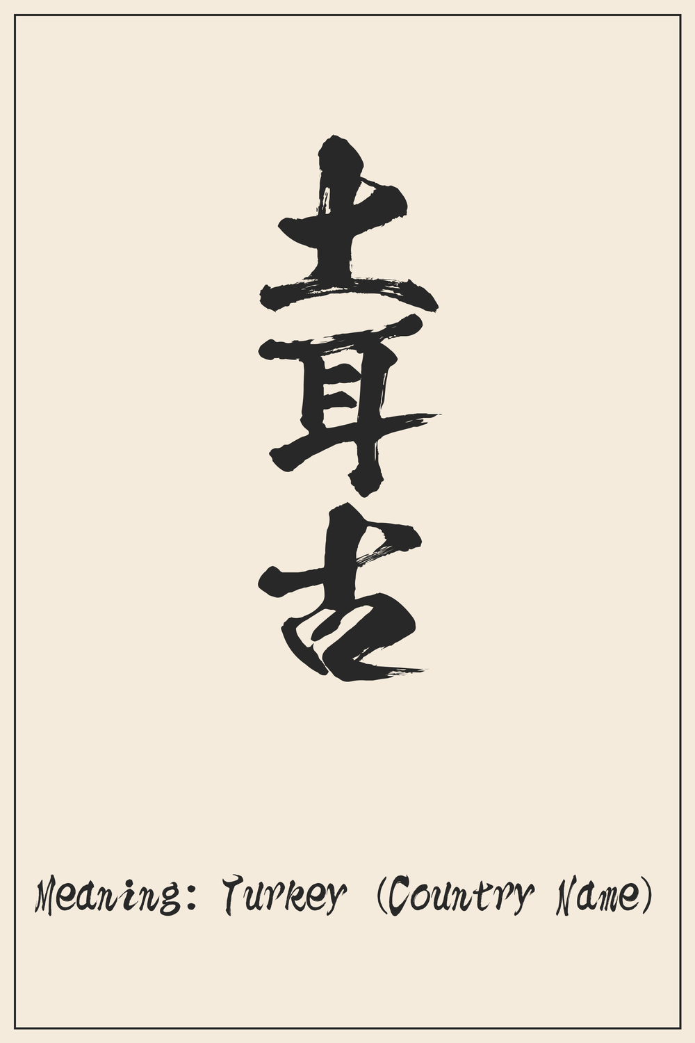 Literalmente, los caracteres individuales se traducen como ‘土’ (tierra), ‘耳’ (oreja) y ‘古’ (antiguo). Estos significados literales no guardan ninguna conexión directa ni simbólica con la nación de Turquía, lo que subraya su función únicamente como transliteración fonética.