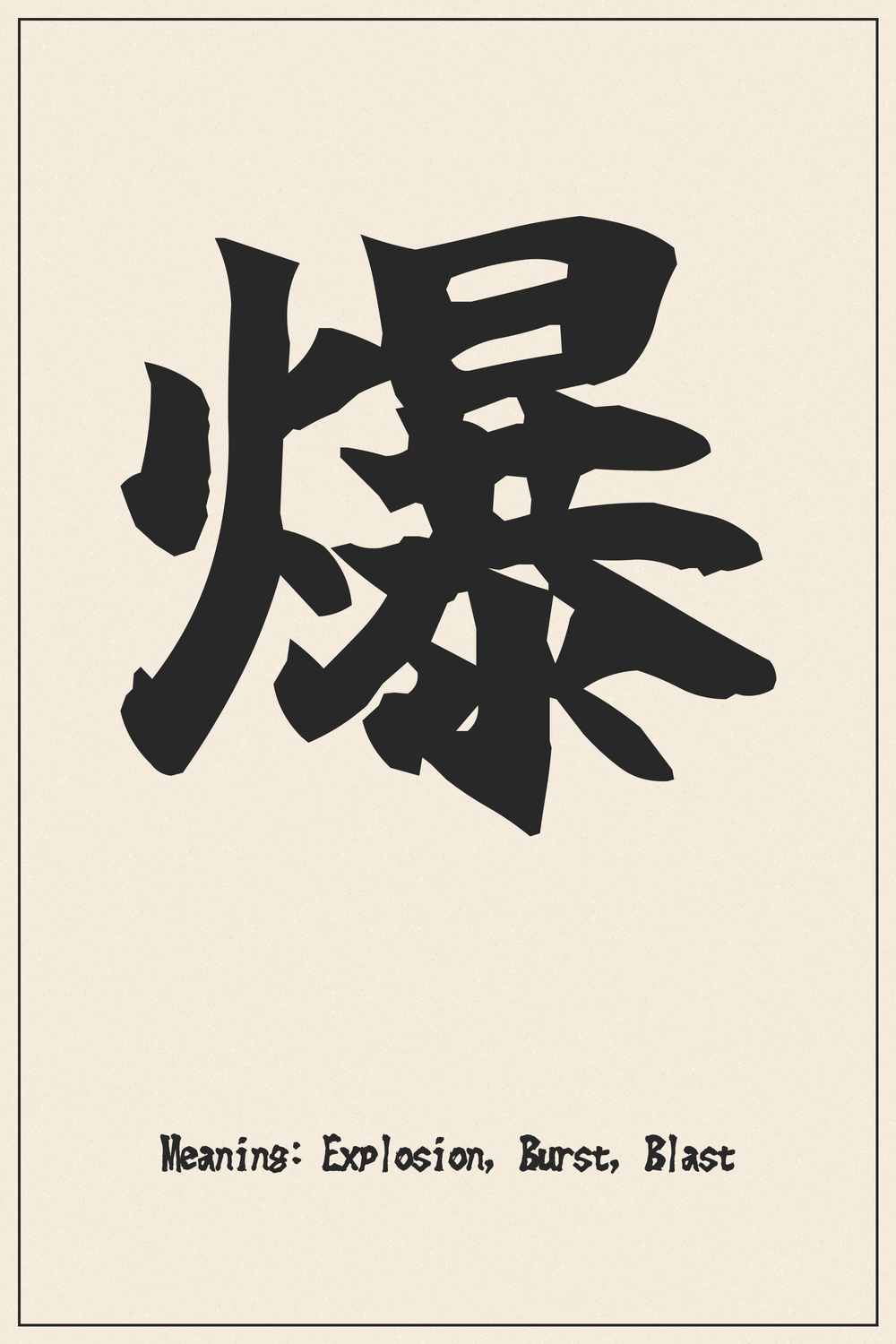The kanji 爆 encapsulates a moment of raw, unbridled energy, representing explosions and sudden, powerful bursts. It is a symbol of dynamic force and impactful change, resonating with themes of intense power.