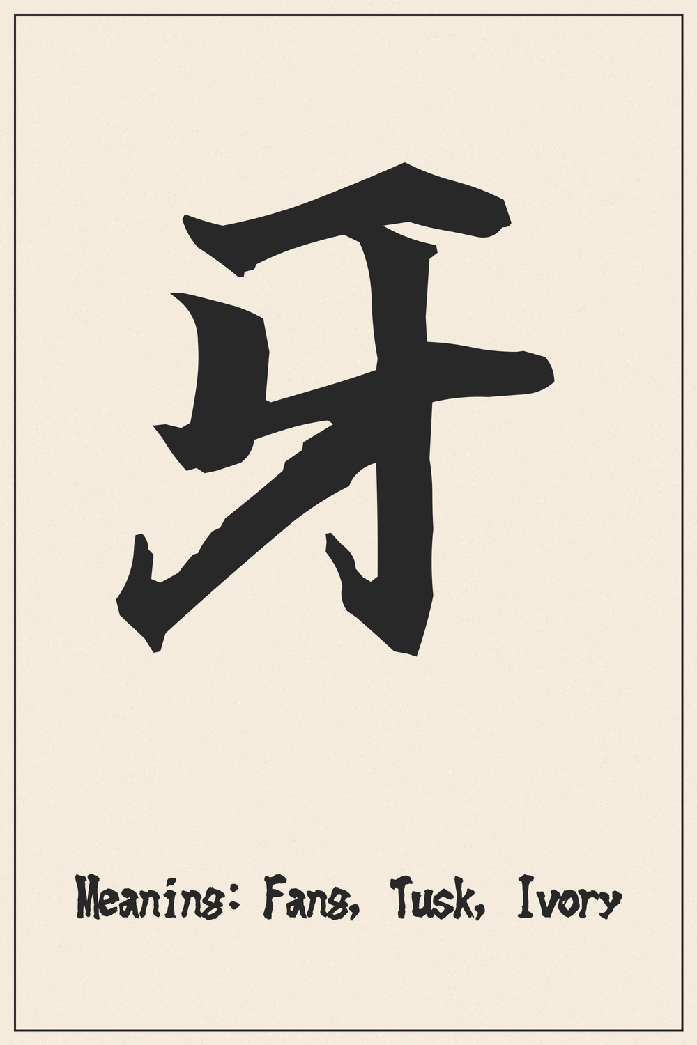Fang, Tusk: This character visually depicts the sharp, pointed tooth of an animal, emphasizing its primal and defensive nature. Its form is an ancient pictograph directly illustrating a tusk or fang.