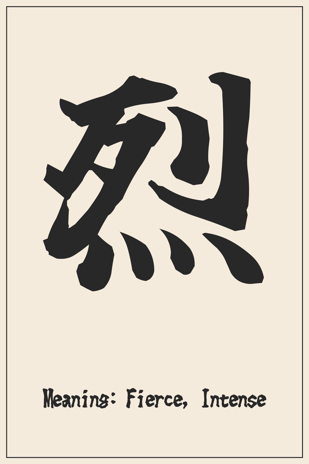 The Kanji ‘烈’ embodies a profound sense of fierce intensity and unyielding spirit. It captures the essence of something powerful, ardent, and formidable.