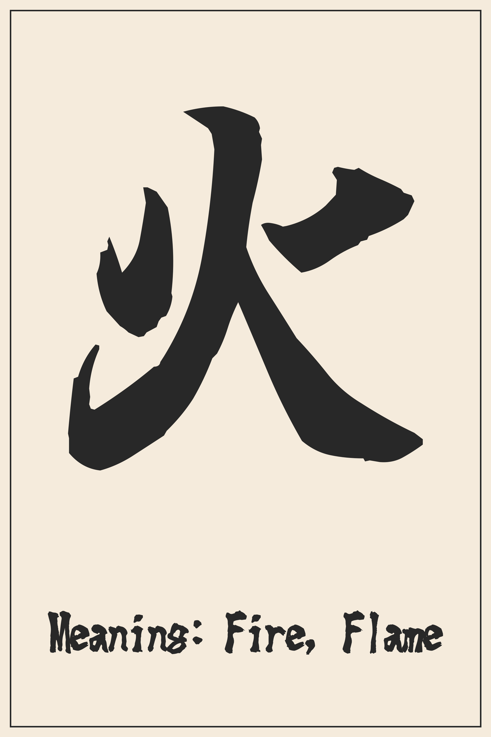 The Kanji for Fire, ็ซ (Hi/Ka), embodies primal power and transformative energy. It symbolizes passion, destruction, and the vital spark of life, resonating deeply across cultures.