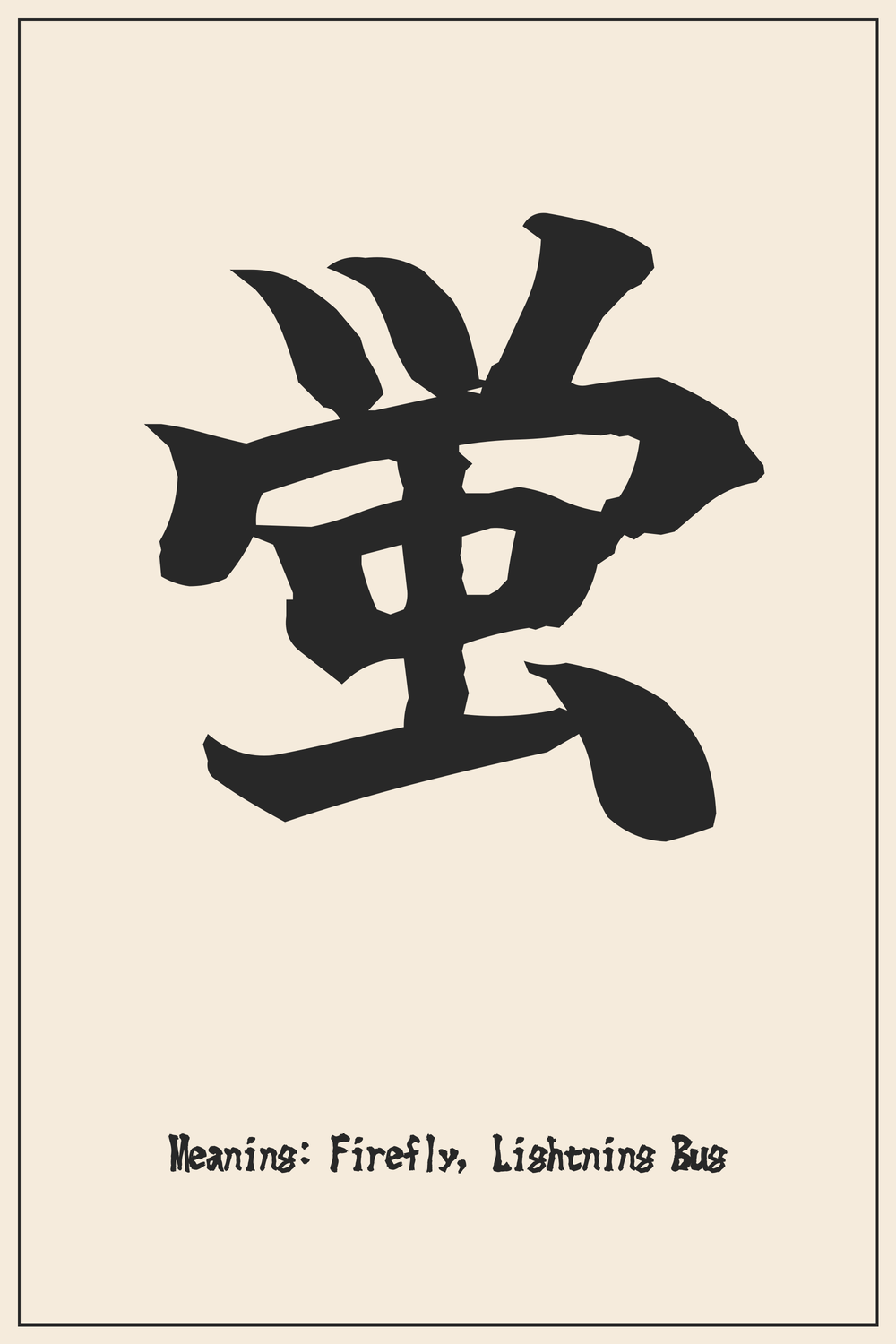 The Kanji 蛍, or hotaru, is a symbol of delicate beauty, ephemeral existence, and the quiet magic of nature. It speaks to the transience of life while celebrating the unique light that each being carries.
