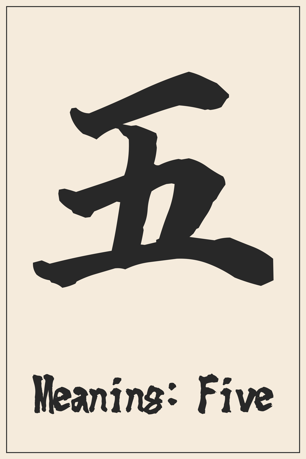 Meaning: Five (Number): This character directly represents the cardinal number five. Its graphic origin is often linked to the depiction of crossed strokes, signifying a count of five.