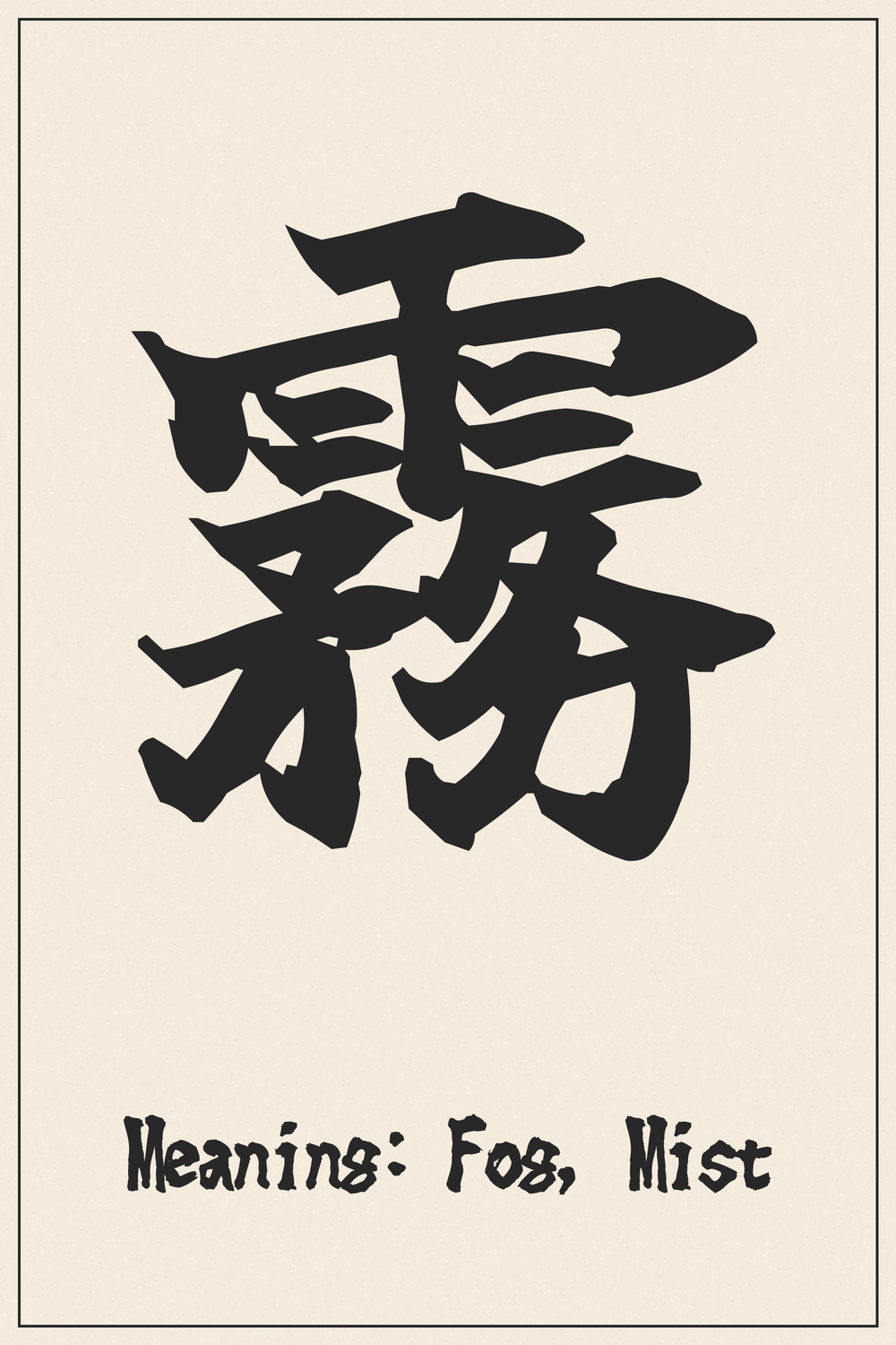 The Kanji 霧 encapsulates the elusive beauty and profound mystery of mist and fog. It evokes a sense of transient presence, often seen as a veil between worlds or a symbol of contemplation.