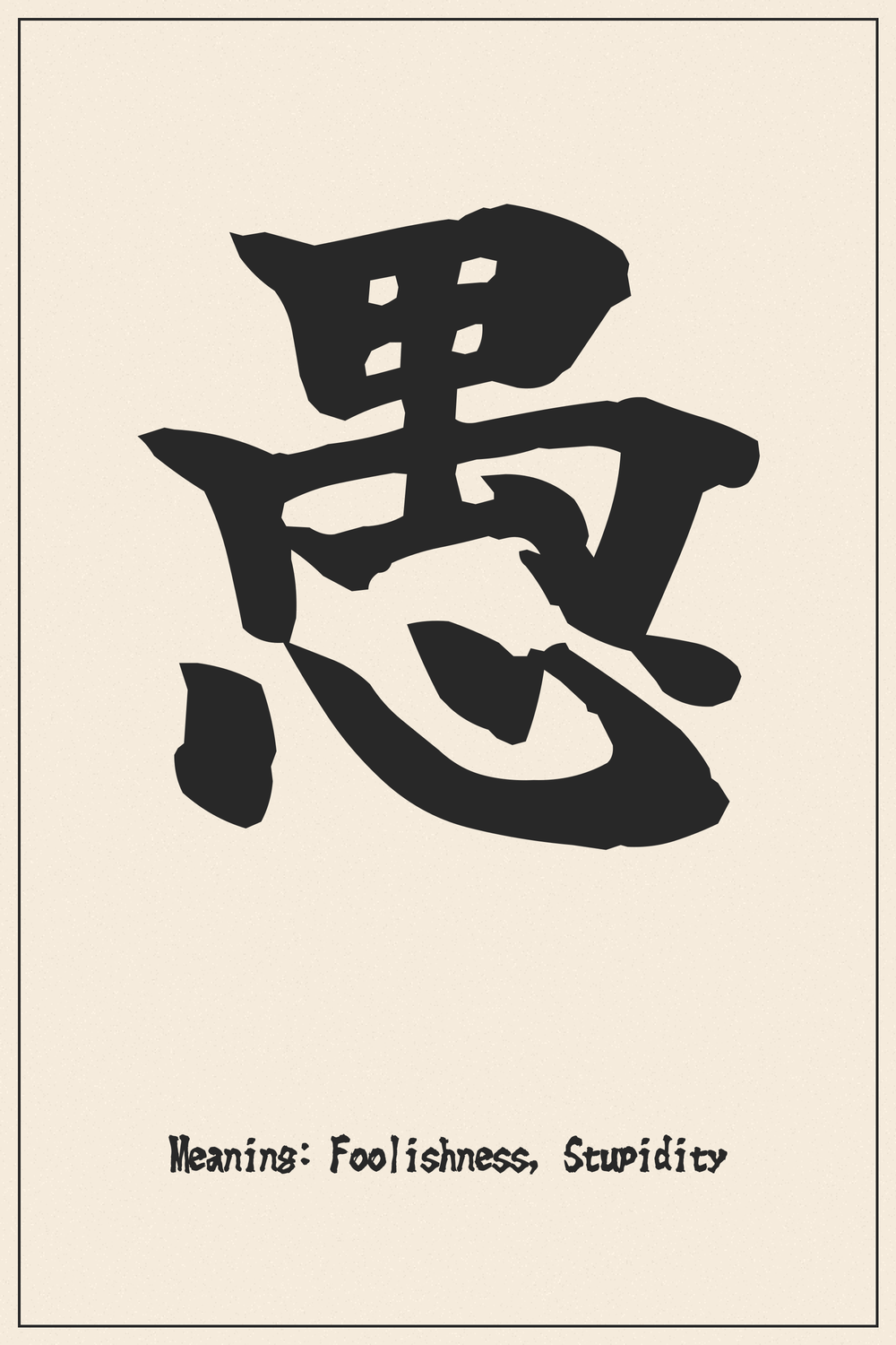 The Kanji 愚 (GU) encapsulates the concept of foolishness or stupidity. Its etymological roots trace back to depictions of a monkey, often associated with erratic or thoughtless behavior, combined with the radical for ‘heart’ or ‘mind’. This ancient pictographic combination suggests a mind that acts impulsively or without proper consideration, akin to the actions of a monkey.