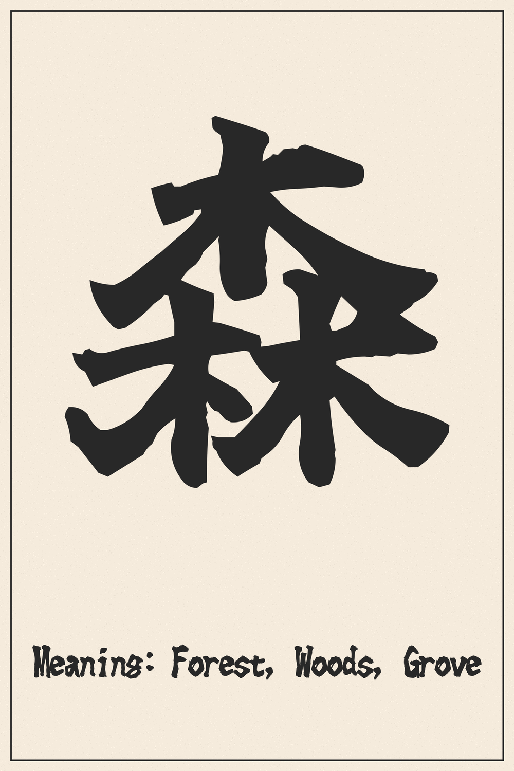 The Kanji 森 (Mori) elegantly embodies the concept of a forest, representing not just a collection of trees, but also the lushness, mystery, and life-sustaining power of nature. It speaks to abundance, sanctuary, and the interconnectedness of life on Earth.