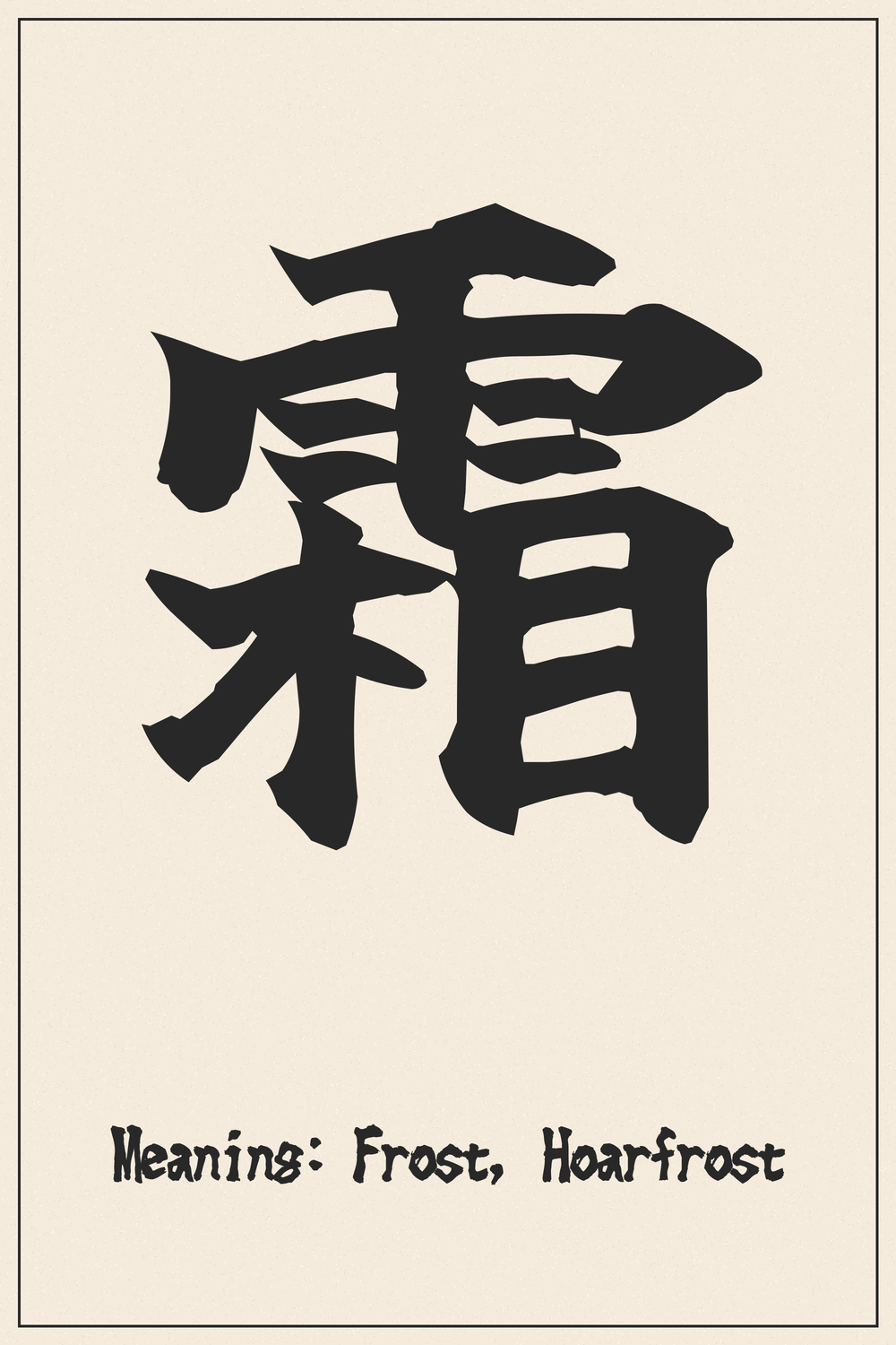 The Kanji 霜 evokes a crisp, ethereal beauty, capturing the serene yet powerful essence of winter’s embrace. It’s a symbol of transformation, purity, and the quiet strength of nature.