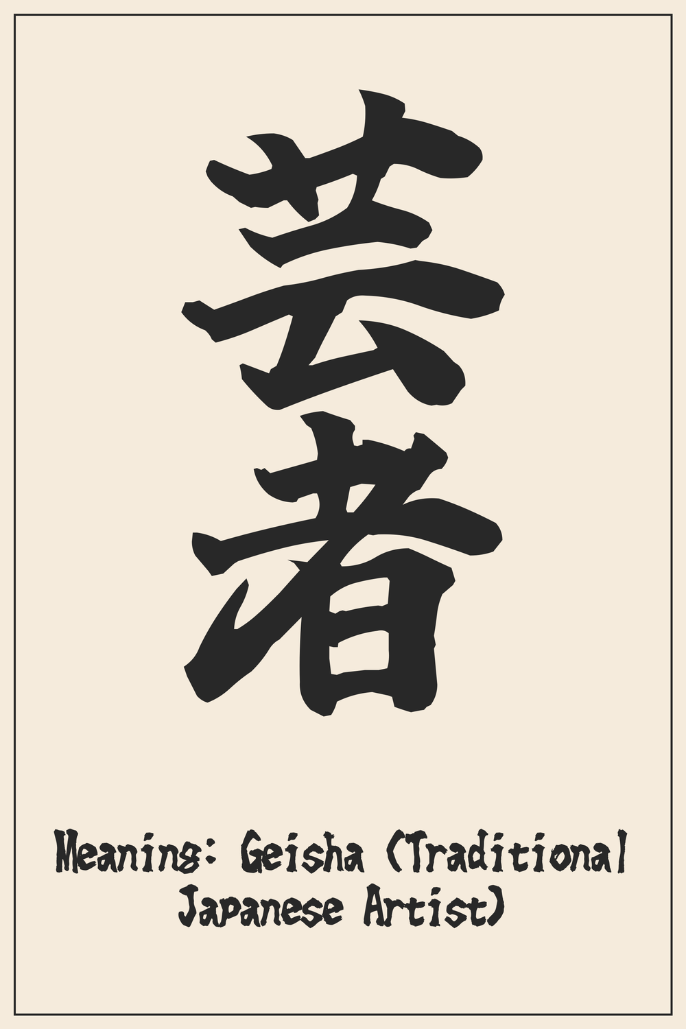 The Kanji for ‘Geisha’ embodies centuries of artistic discipline and cultural elegance. It represents a profound dedication to traditional Japanese performing arts.