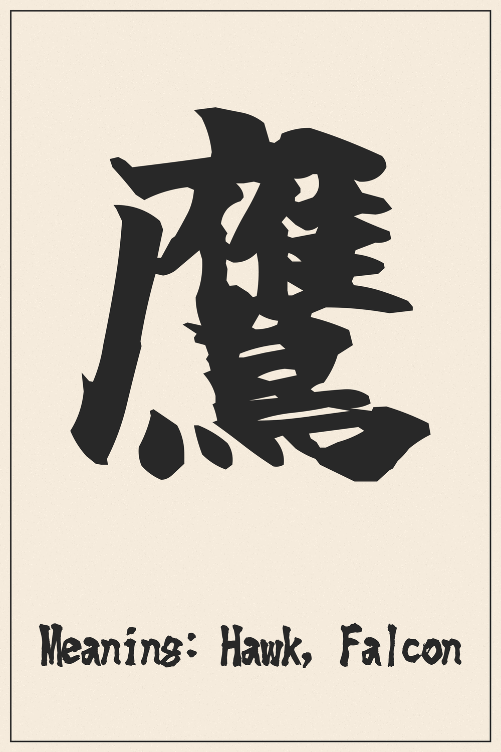 A powerful predator of the skies, 鷹 (Taka) embodies fierce independence and sharp perception. This single Kanji captures the essence of a majestic bird soaring with unparalleled grace and might.