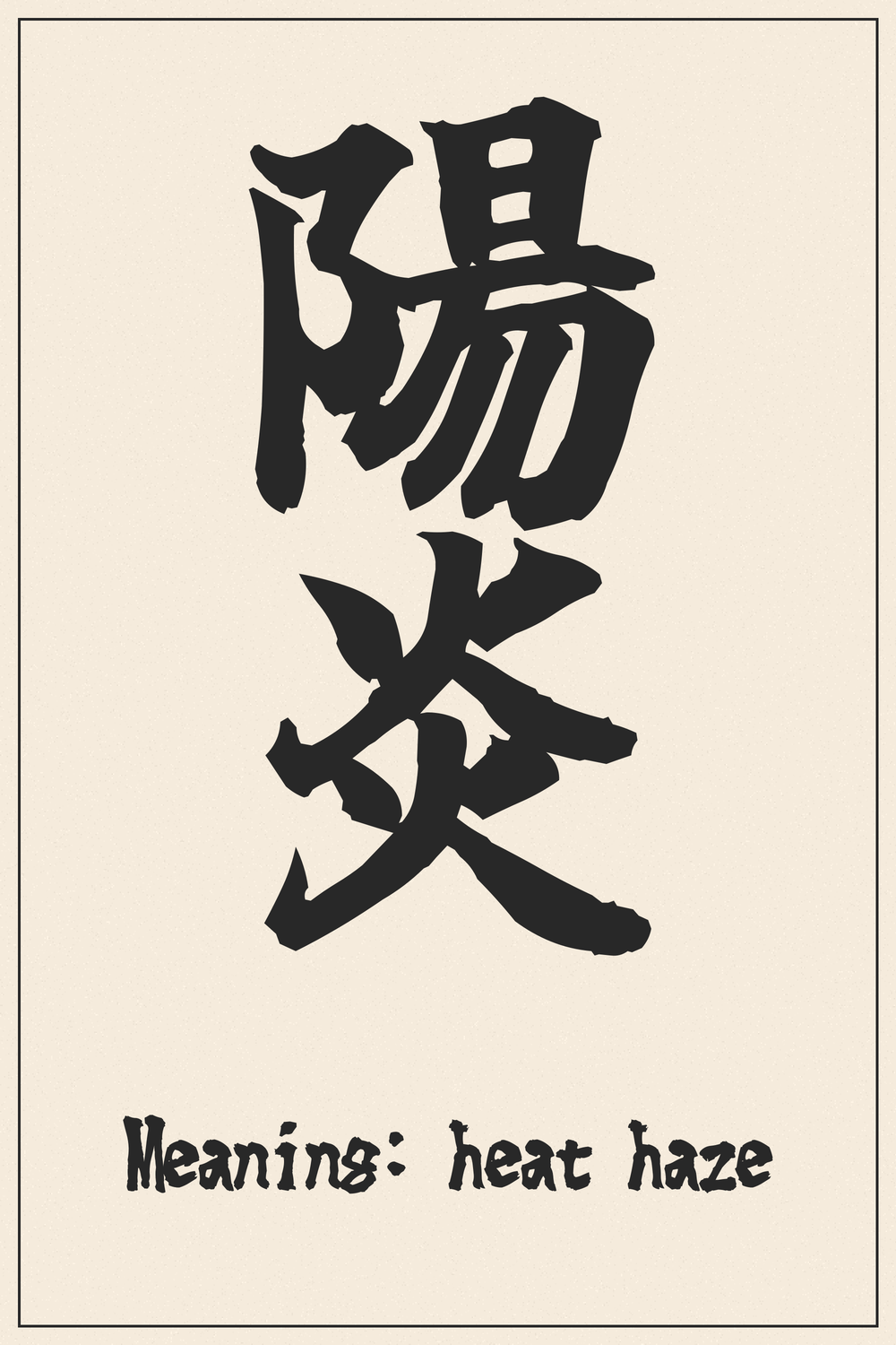 陽炎は、夏の日に見られる揺らめく熱の波を表現しています。この漢字は、一瞬の美しさと自然の神秘を象徴し、人生の儚さを大切にすることを思い出させるものです。