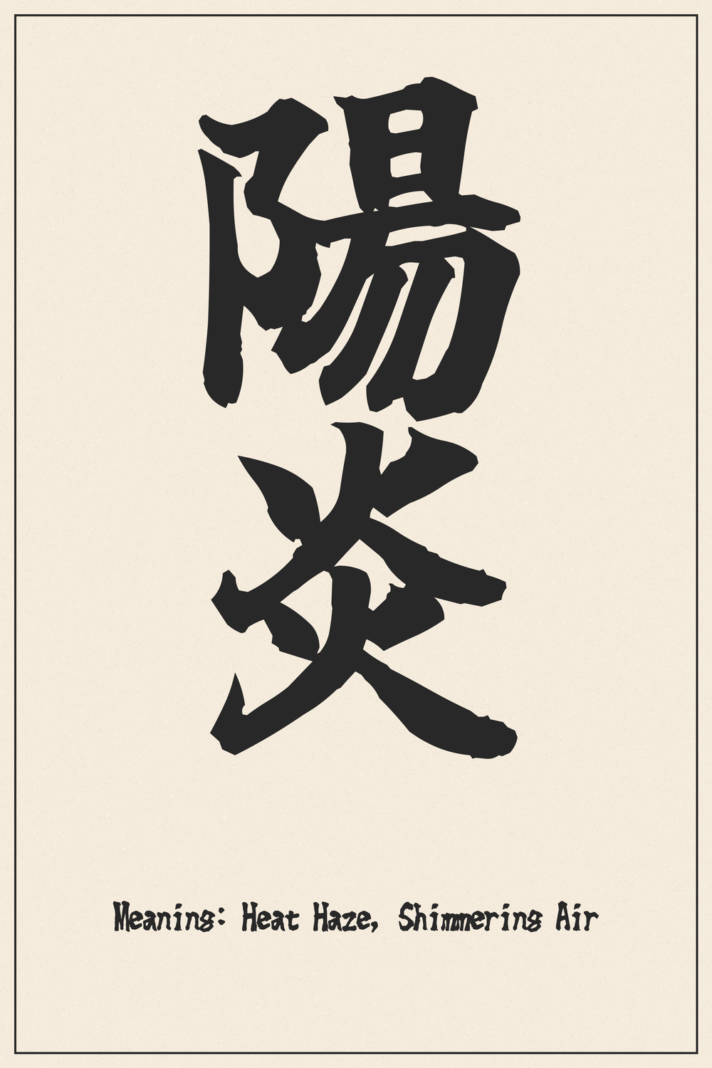 The Kanji 陽炎 beautifully encapsulates the visual poetry of a heat haze, representing not only a natural phenomenon but also deeper themes of ephemerality, illusion, and the beauty found in fleeting moments. It’s a choice for those who appreciate the subtle yet profound aspects of nature and existence.