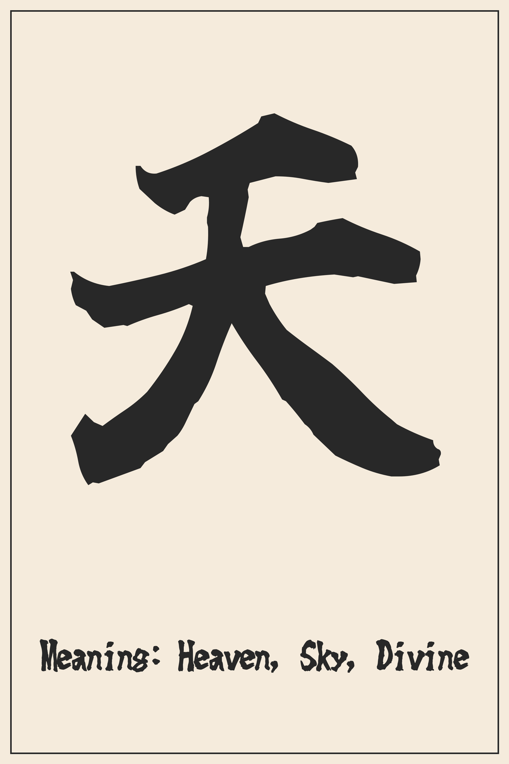 The kanji 天 (Ten) is a symbol of immense power, representing the vastness of the heavens and the divine forces that govern existence. It encapsulates concepts ranging from the literal sky above to destiny and spiritual realms.