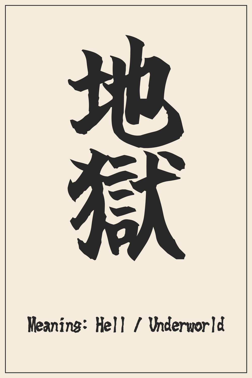The Kanji for ‘Jigoku’ (地獄) powerfully evokes the concept of Hell, a realm of profound consequence and suffering. It represents a spiritual journey through the darkest aspects of existence, resonating with deep philosophical and religious undertones.
